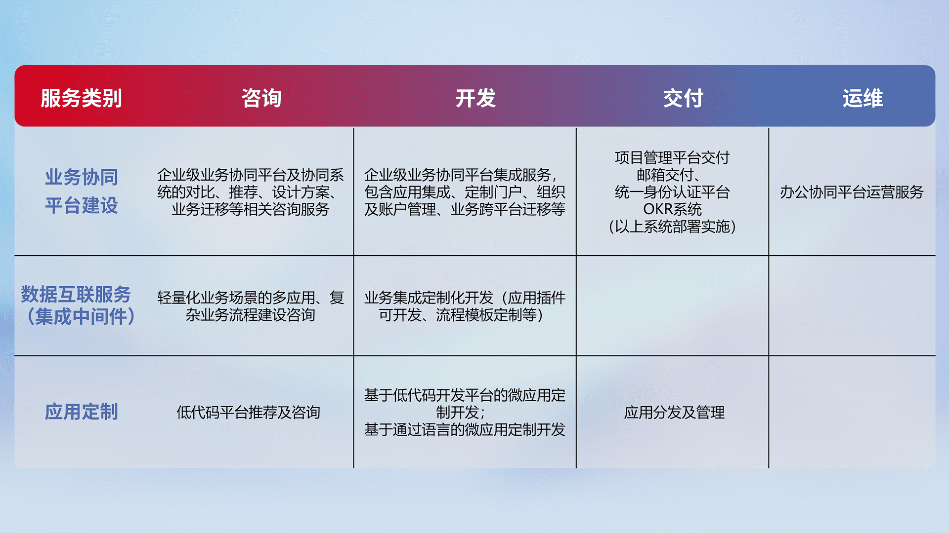 针对钉钉、、、、企微、、IDaas等平台级产品提供产品的规划、、、、方案、、、交付、、、定制化开发等服务,,,,实现如统一协同办公、、、智能客户服务、、混合会议管理、、、、智能数据查询、、、、等业务场景,,,实现数字化转型。。。。