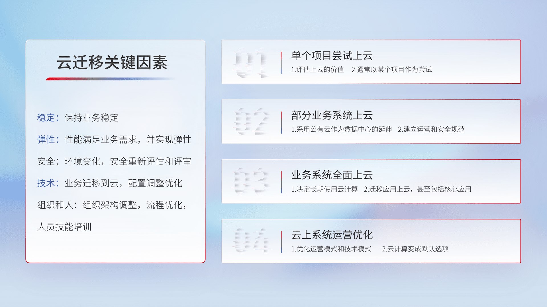 结合实际业务,,,从规划设计、、、云平台选型、、、云原生改造、、、、数据迁移、、、、集成交付,,,迁移全过程为客户识别最佳上云路径,,做好风险识别管理,,,,设计网络架构、、、身份权限、、、安全审计合规、、操作审计、、、、日志审计、、监控告警策略、、多站点容灾设计等,,对云上基础设施进行整体规划,,提升IT治理水平,,,,以满足弹性、、高可用、、、、高性能的需求。。。。