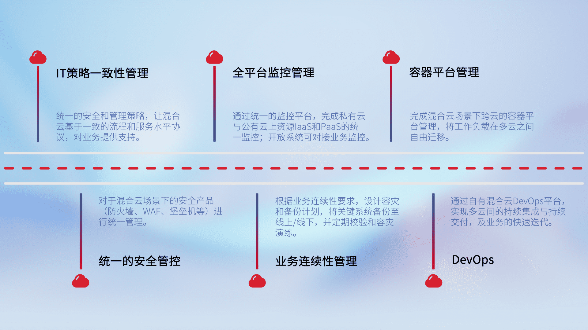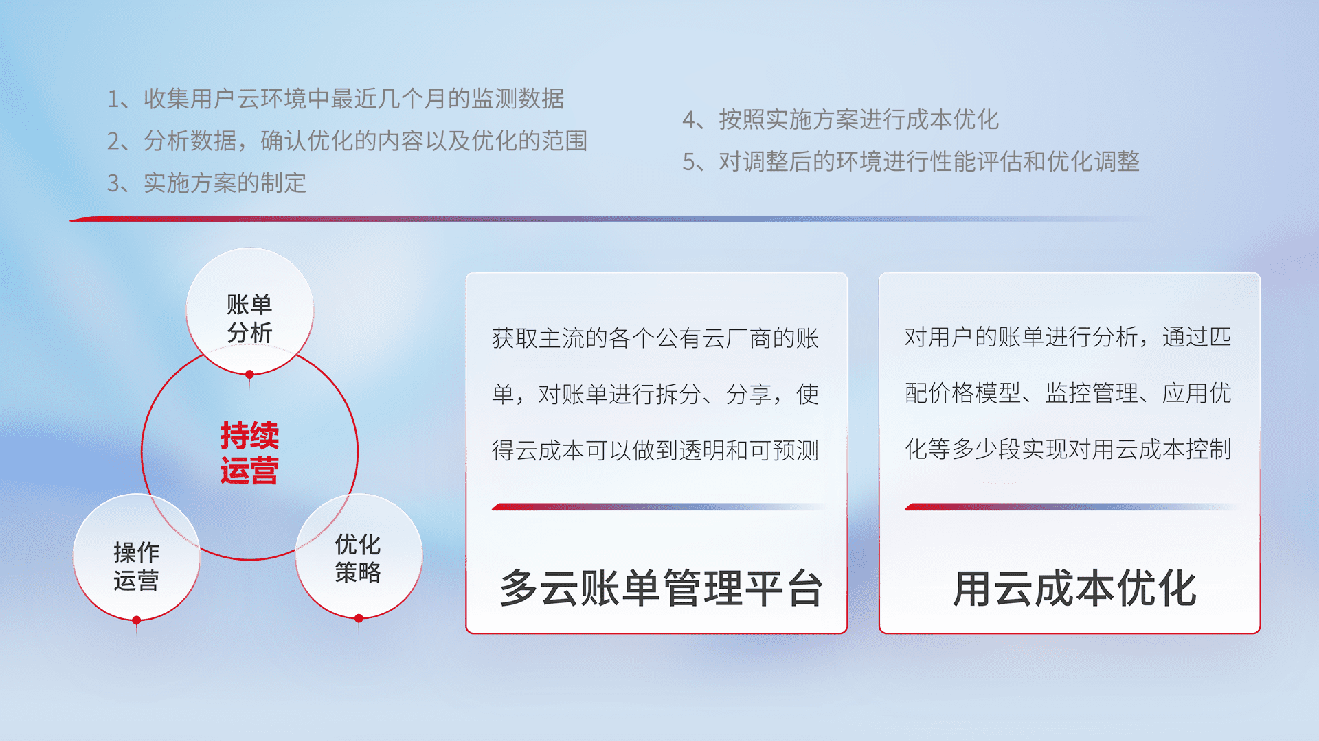 通过多云纳管,,以统一的资源数据模型把客户的云资源进行抽象和封装,,,,进而实现对多云资源的统一操作,,,,保障云资源管理的可靠性、、稳定性与可用性。。。。量身定制化运维内容,,,,配置、、开发运维、、、、补丁管理、、、备份、、、监控、、、认证和访问管理、、审计和日常巡检等,,,,保障在用云过程中的可靠度,,,稳定度以及高可用率。。。
