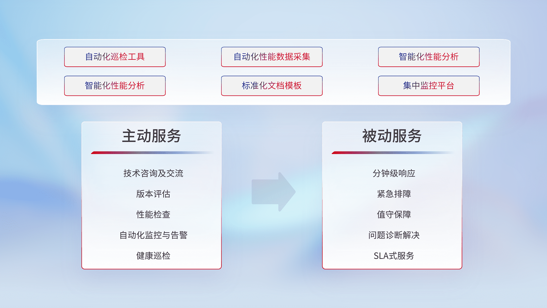 智能化工具和标准化文档,,保障服务质量,,,提供主动服务(包含技术咨询、、版本评估、、、、性能检查、、、、自动化监控与告警、、、、健康巡检)和被动服务包含(分钟级响应、、、紧急排障、、值守保障、、、问题诊断解决、、SLA服务)。。。。
